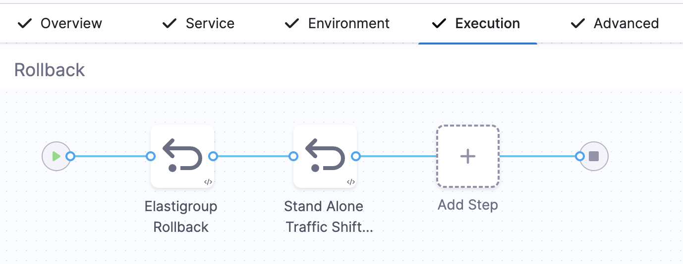 If you do not select the Add Traffic Shifting Steps checkbox, then your execution tab will include Elastigroup Blue Green Setup and Elastigroup Swap Route.