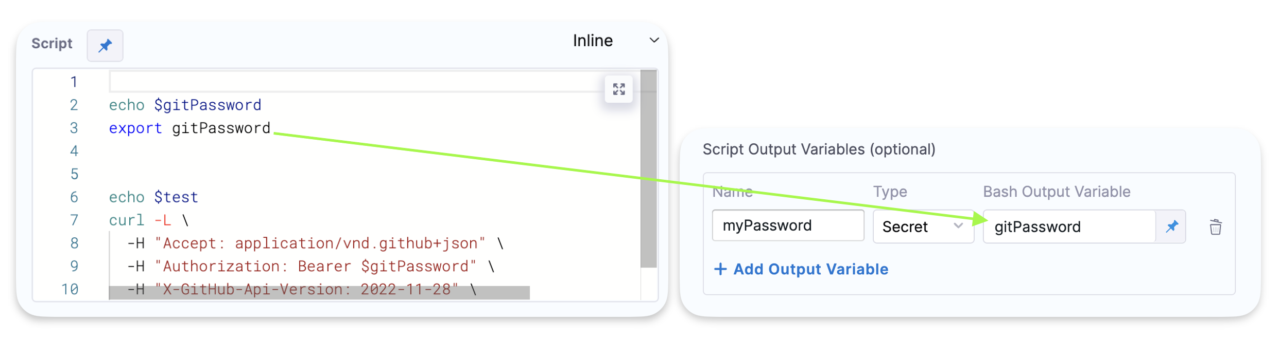 Output variables are passed from the the script output to the Harness pipeline and can be referenced in subsequent steps and settings using expressions.