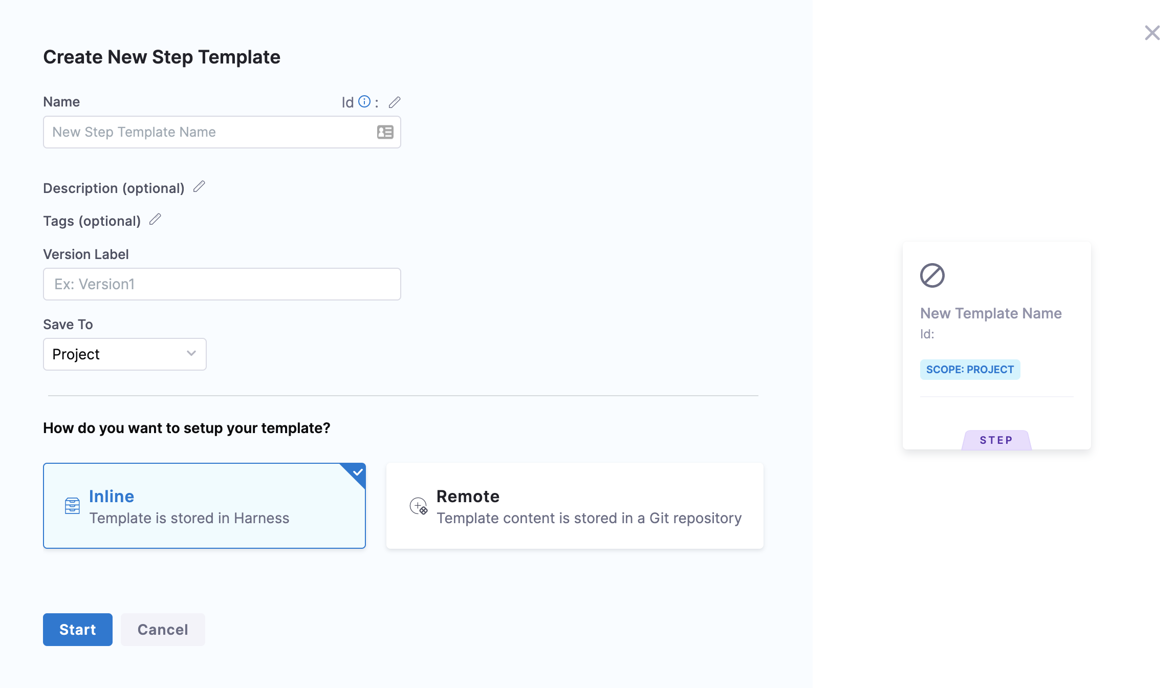 You can create a Template and save it either in Harness or in a Git repository using the Inline or Remote option respectively.