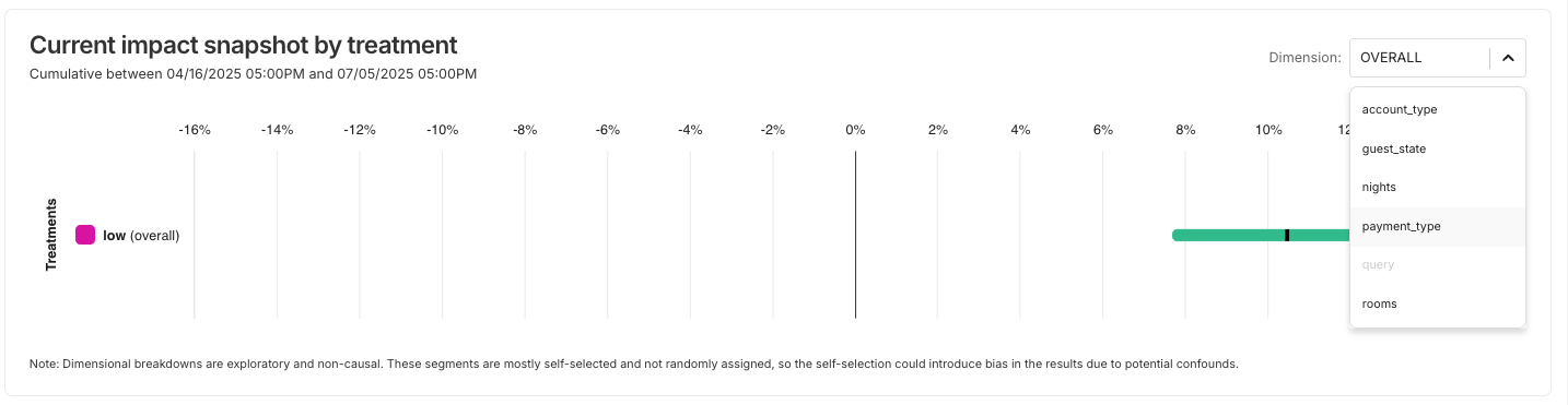 View your dimensions in the Impact snapshot graph. This graph provides you with an up-to-date, aggregated view of the impact and confidence interval broken out by dimension over baseline for each treatment.