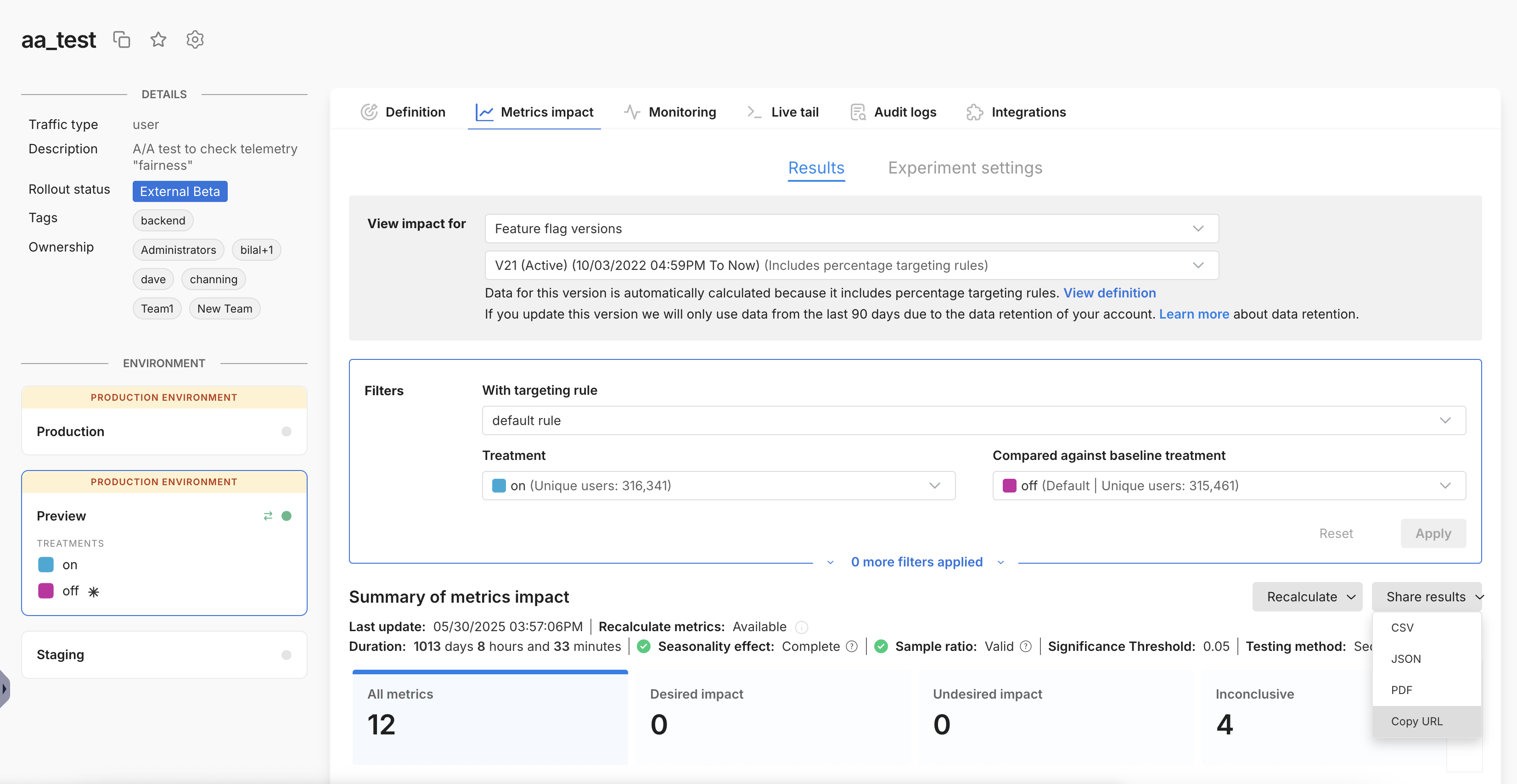 • The results reflect the version, rule, and treatments selected in the filter box above, including any metric tag or metric owner filters applied.