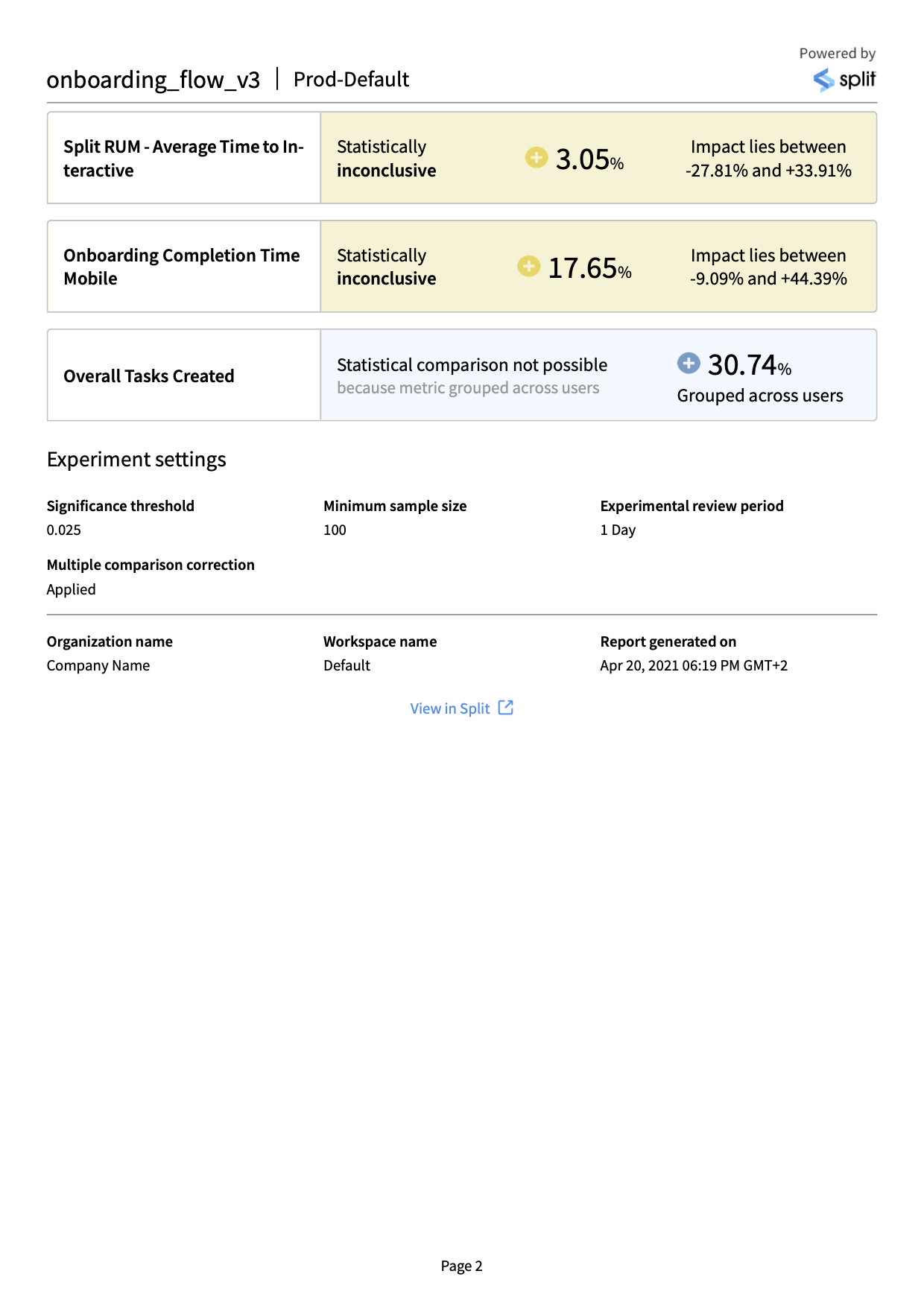 • PDF: This format presents a visual representation of your metrics impact results, similar to the Split UI. This format is ideal for sharing results with stakeholders and for quickly understanding the high level outcomes of your tests.
