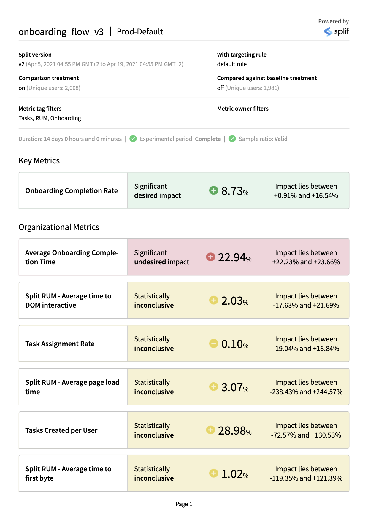 • PDF: This format presents a visual representation of your metrics impact results, similar to the Split UI. This format is ideal for sharing results with stakeholders and for quickly understanding the high level outcomes of your tests.