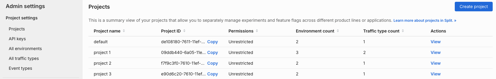 Each Split project has a project permissions setting which you can use to restrict access to that project to specific users, groups, or API keys. If a user, group, or API key is not granted access to a restricted project, they cannot see the project name nor determine whether that project exists.