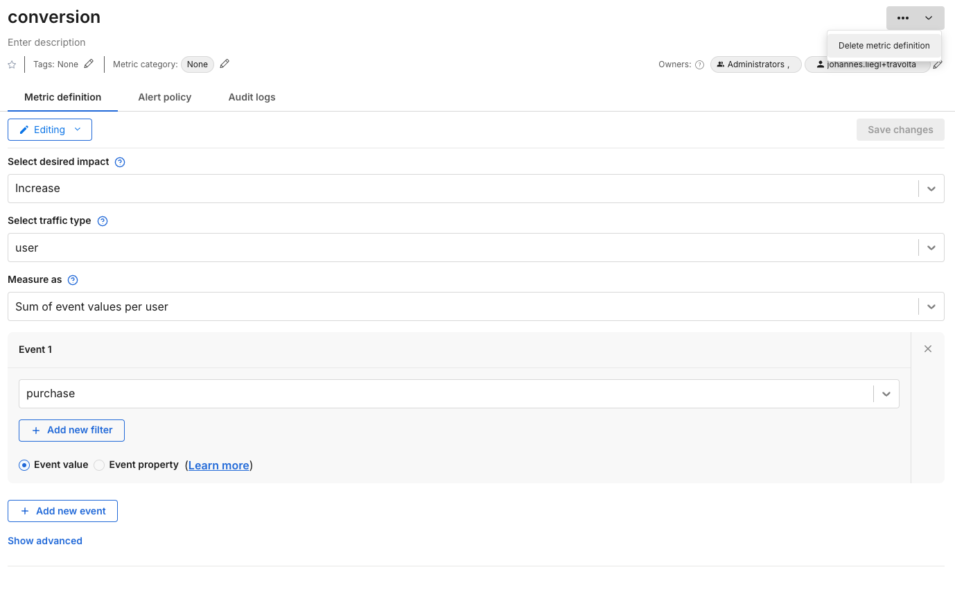 • To delete metrics, click on the upper top right (...) icon to delete it.