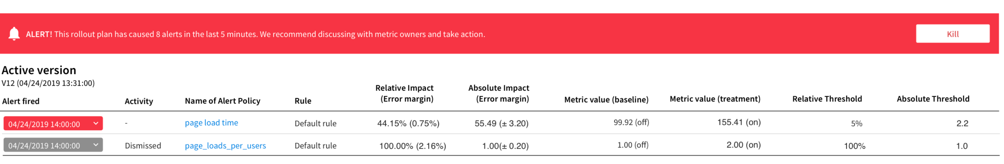 If a key metric is linked to a percentage-based rollout, Release Monitoring automatically detects and alerts on statistically significant changes to that metric during the rollout.