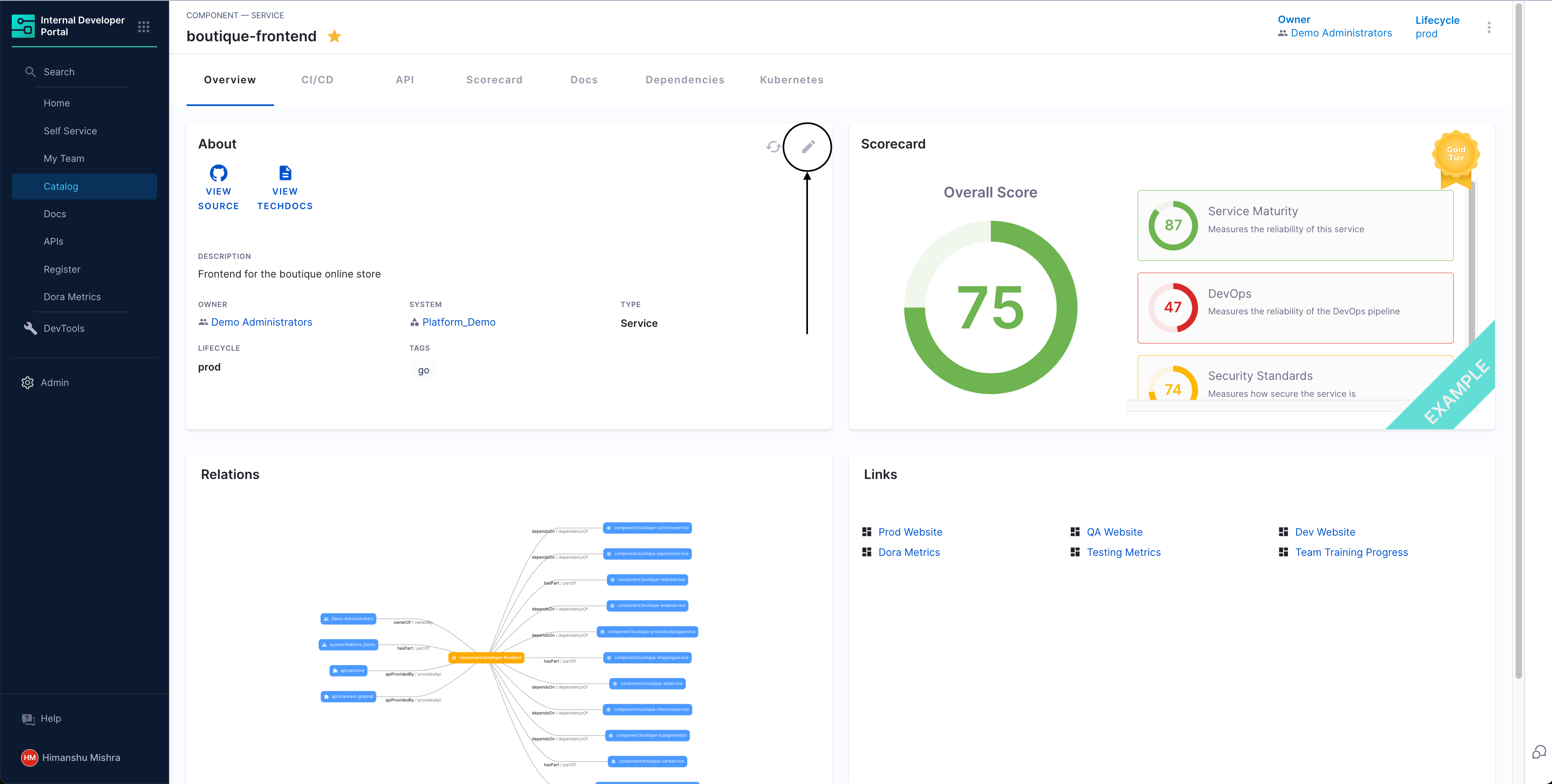 Anyone can update the definition of a software component by updating the component's catalog-info.yaml file. You can also use the edit button on the catalog page to go to the component's source location.