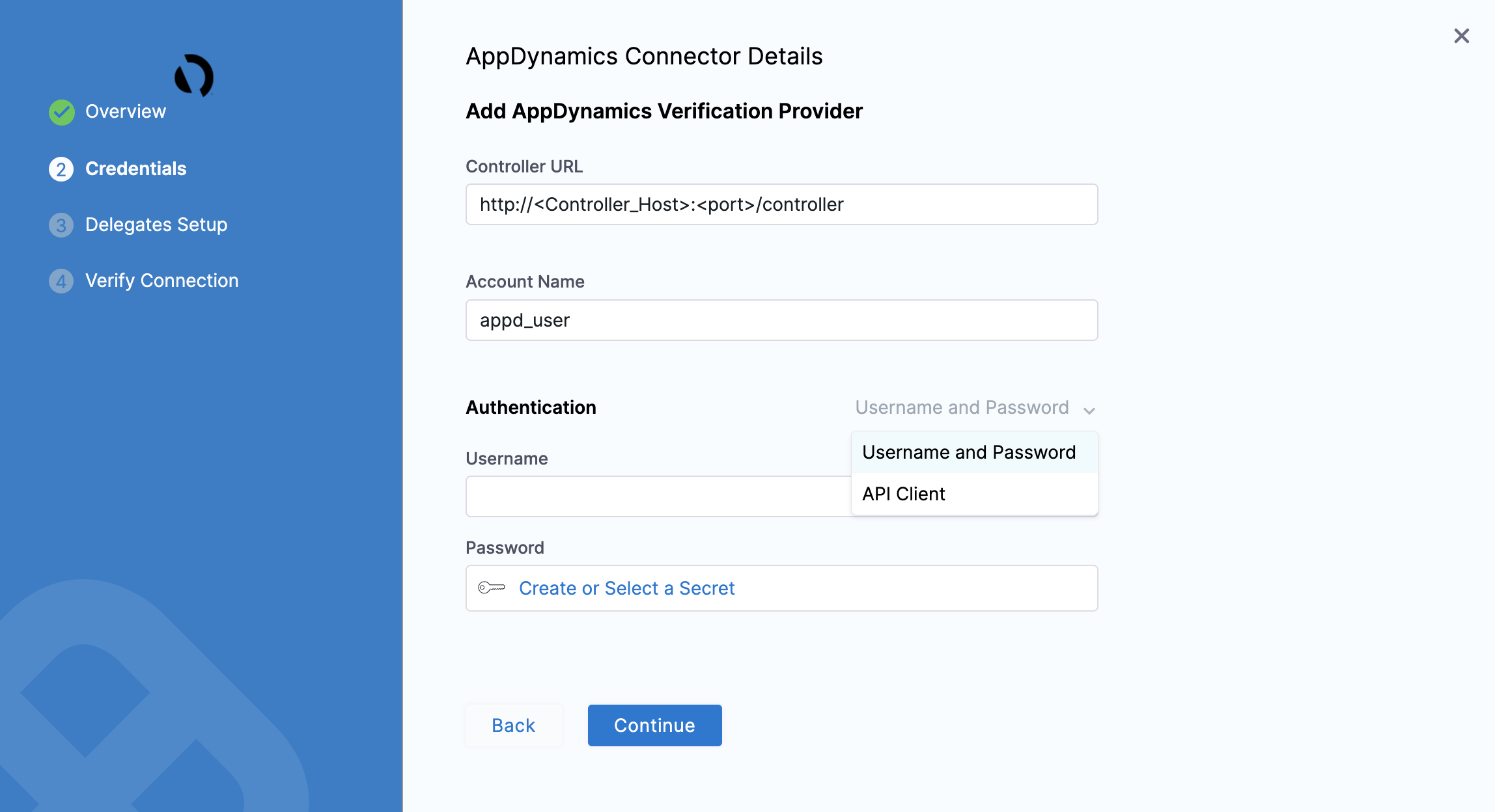 - Username and Password: In User Name and Password, enter the credentials to authenticate with the AppDynamics server. In Password, you can choose Create or Select a secret.