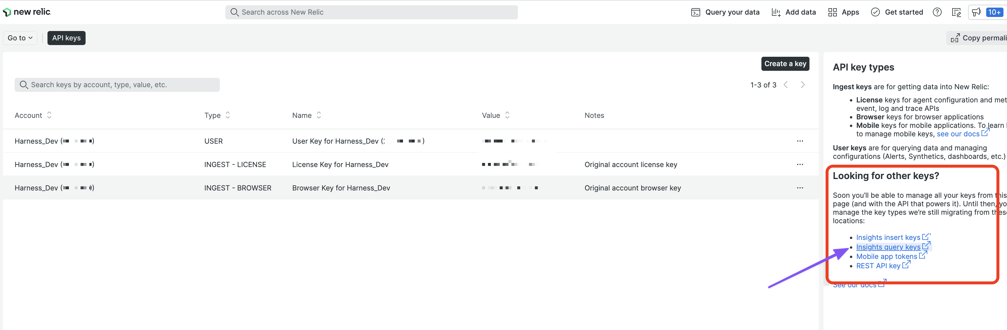 If you have trouble finding the step on generating the Insights query key, look for the API key types help in the New Relic help panel: