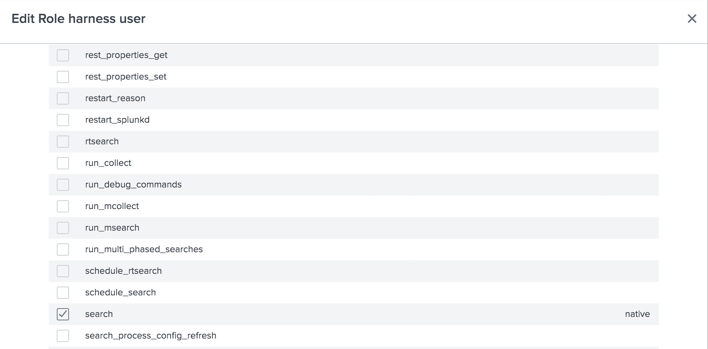In the following example, we've created a new Splunk role named Harness User, and assigned it search capability: