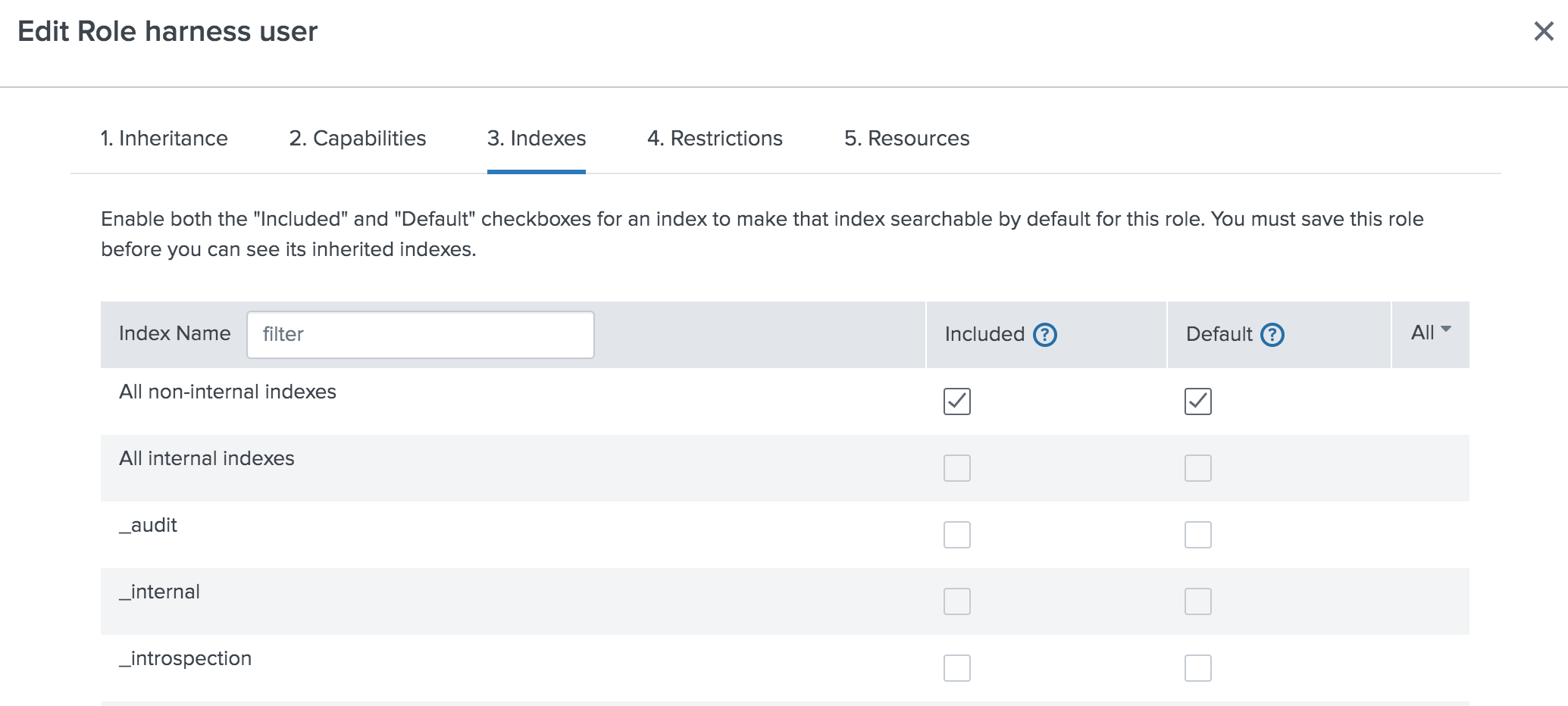 We've given this role access to All non-internal indexes. However, we could restrict the access to only a few relevant indexes: