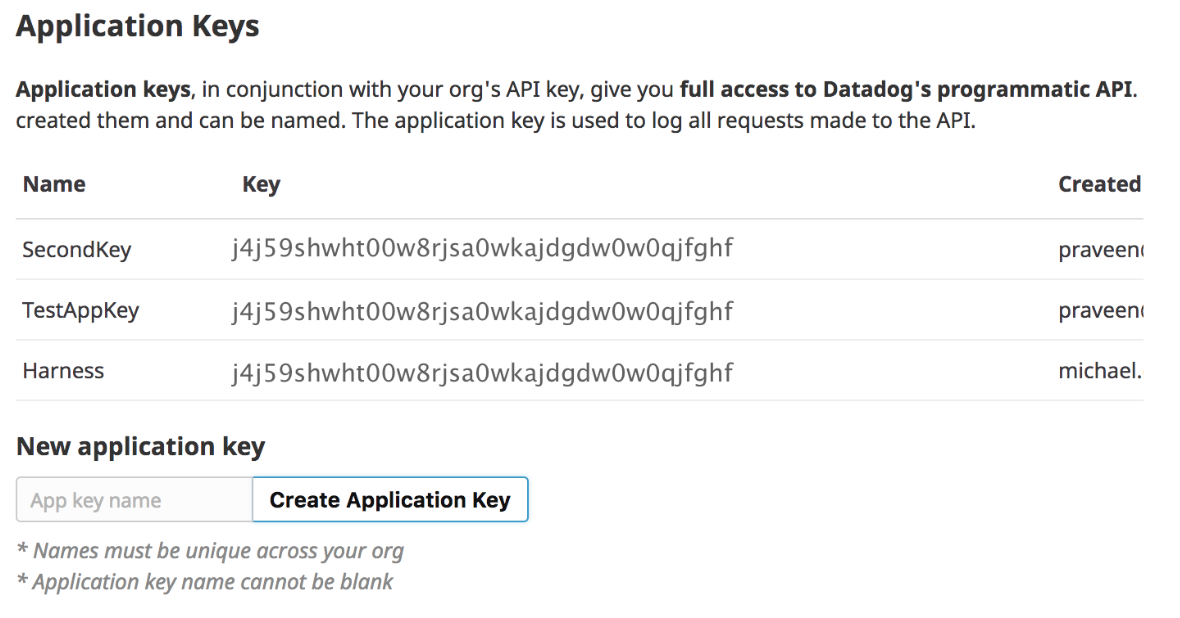In Application Keys, in New application key, enter a name for the application key, such as Harness, and click Create Application Key.