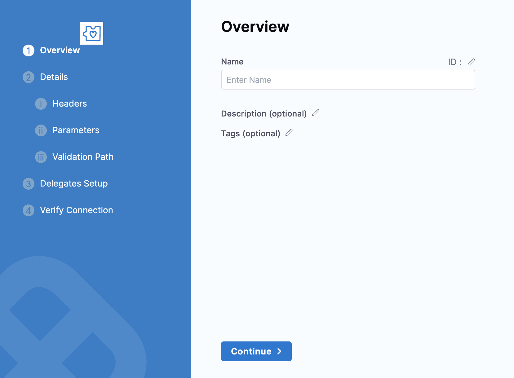 In the Overview tab, enter a name for the connector, an optional description, and a tag, and then select Continue.