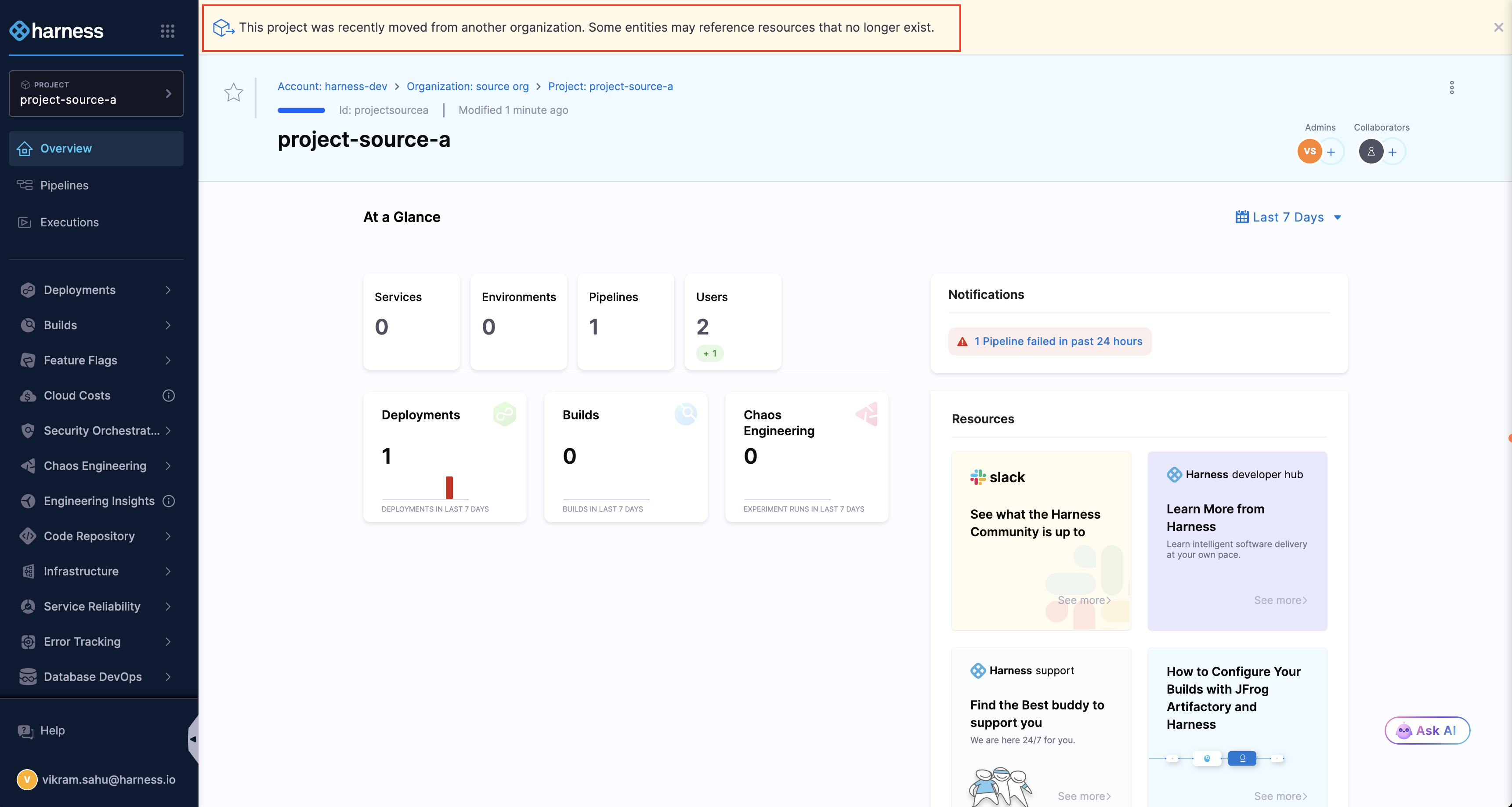 Once the move completes, you'll be redirected to the project in its new organization. A banner appears with the message, "This project was recently moved from another organization. Some entities may reference resources that no longer exist" as shown in the image below.
