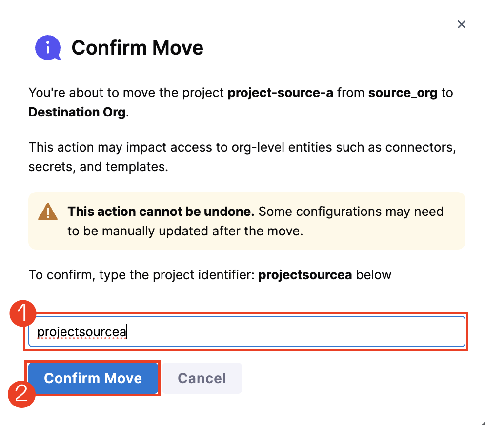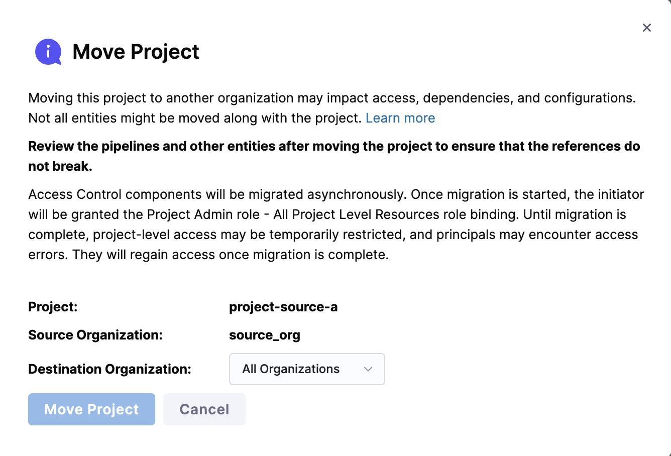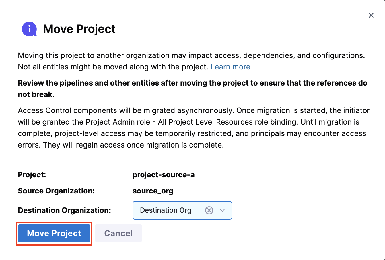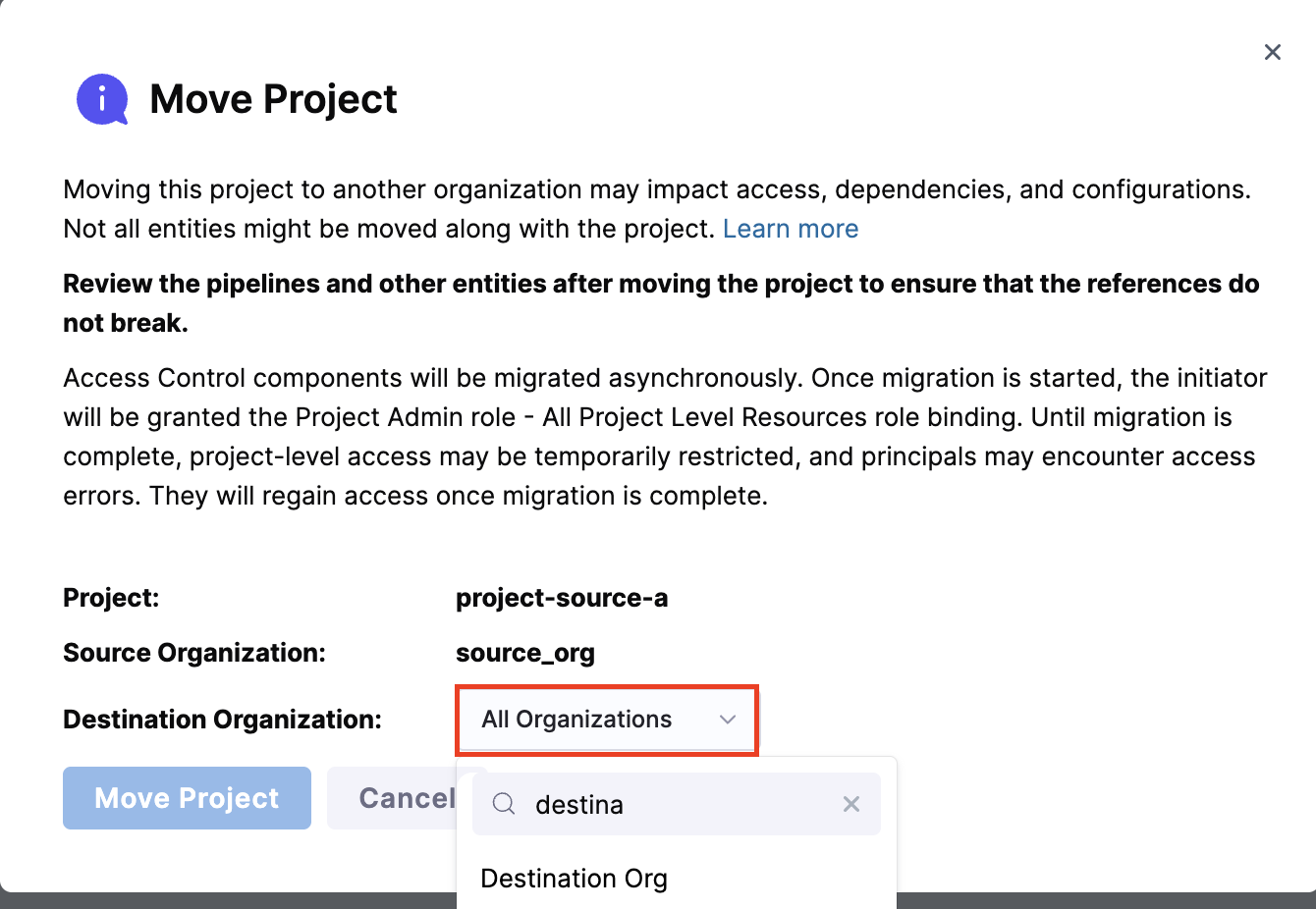 Select the destination organization from the dropdown where you want to move the selected project. Only organizations where you have Create Project permission (