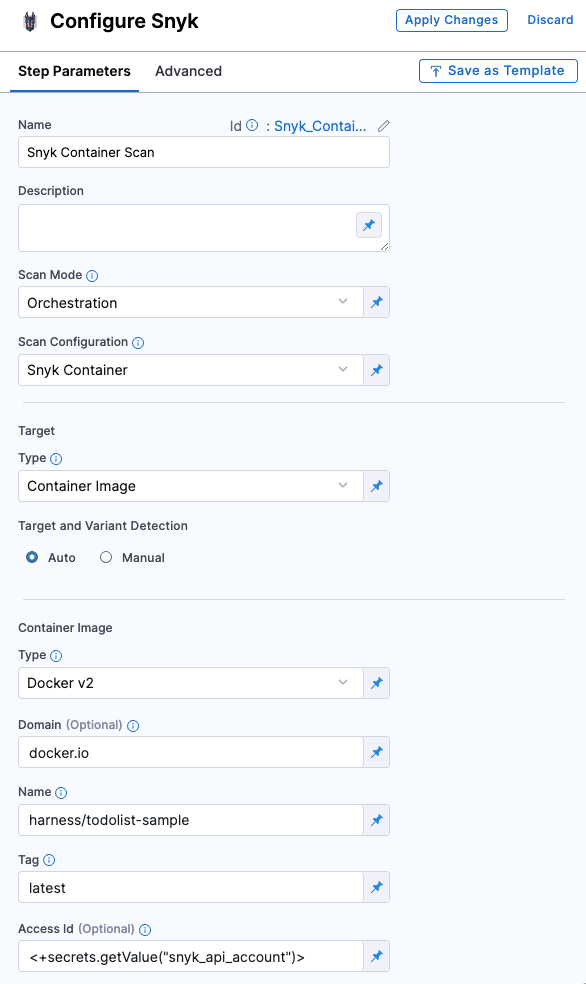 Refer to Snyk step configuration document to learn more about all the fields and their configurations.