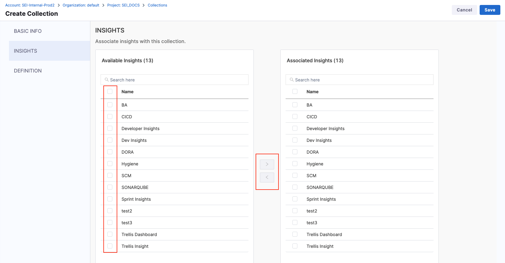 All Insights must be associated with at least one Collection. You can configure these associations through Collection settings or when creating or editing Insights. For information about creating and editing Insights, go to Insights.