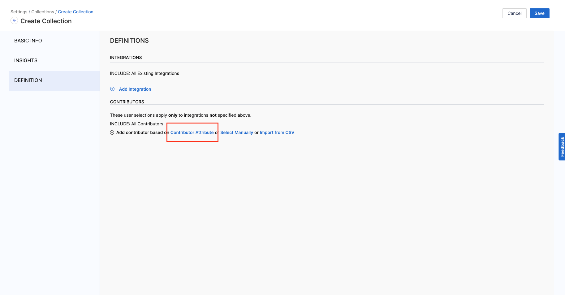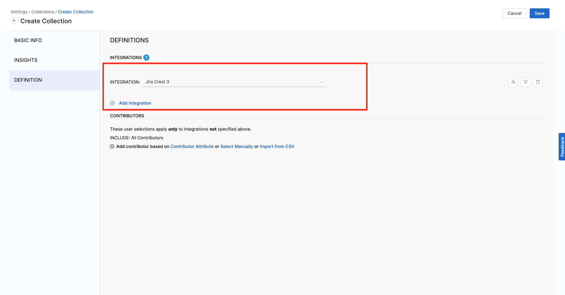 - Add the Integration Filters to determine the criteria to associate Contributors with the Collection.