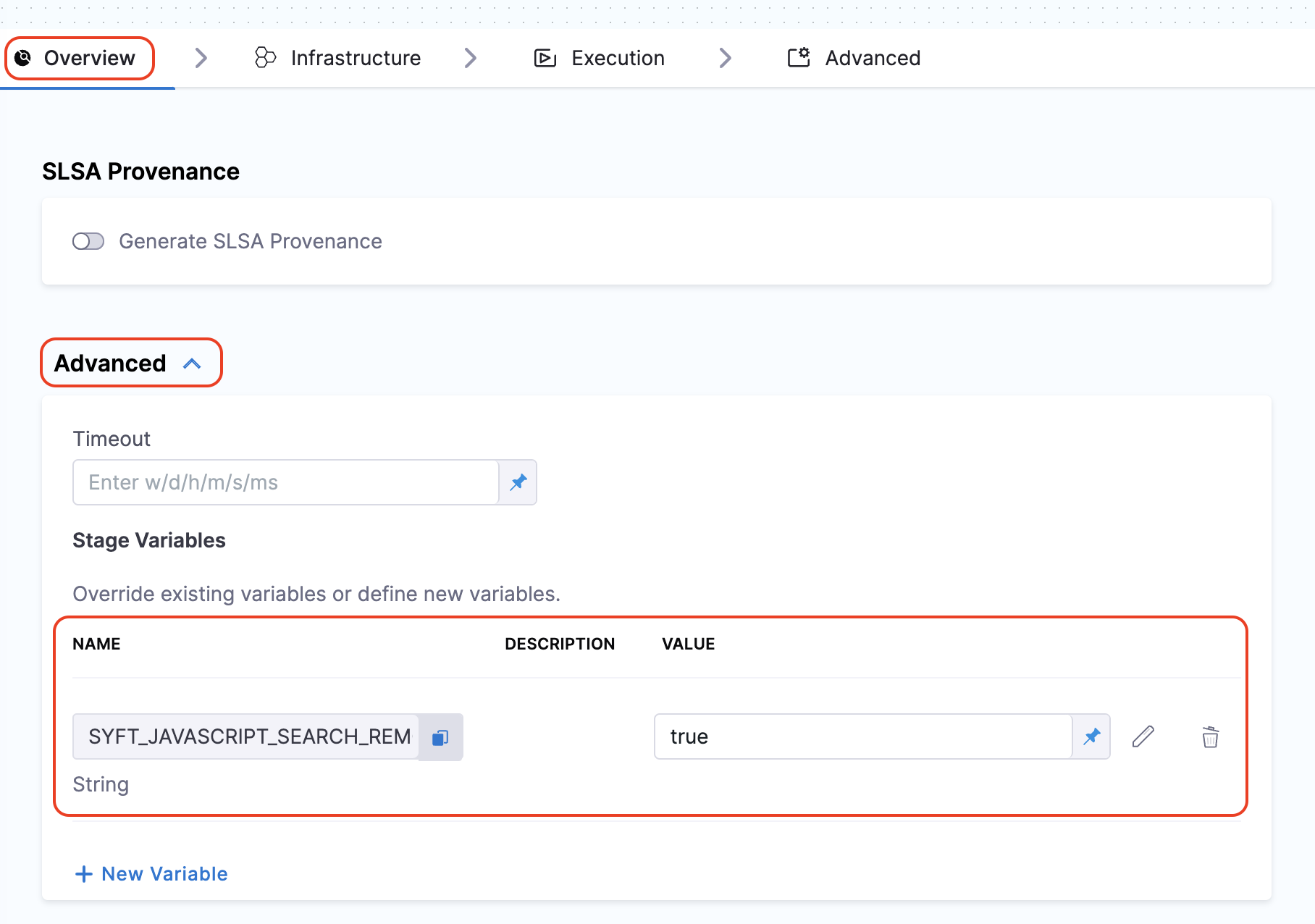 To add a new environment variable, go to Overview section of your Build stage, and expand the Advanced section.